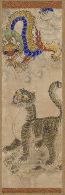 용은 위, 호랑이는 아래. 용은 구름 속이나 화면 상단에, 호랑이는 바위나 땅에 자리 잡습니다. 하늘과 땅의 질서를 시각적으로 표현한 것입니다.