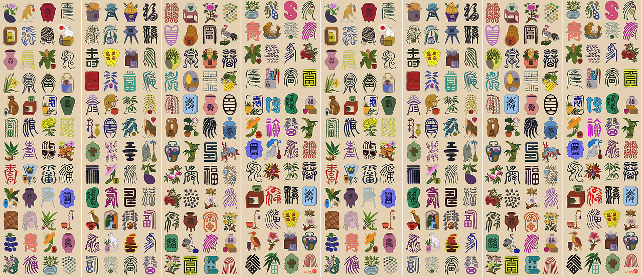 백수백복도에는 글자만 있는 게 아닙니다. 글자 사이사이에 다양한 길상 무늬가 함께 그려집니다.